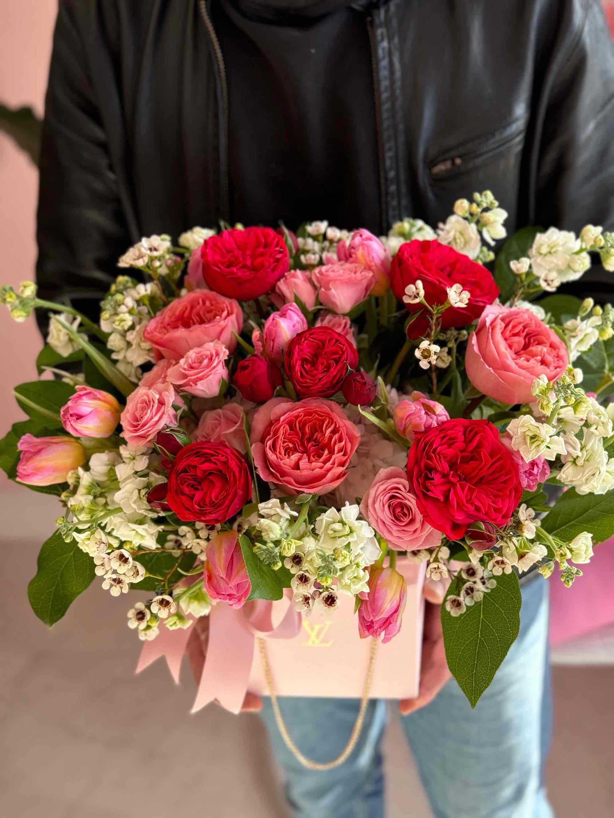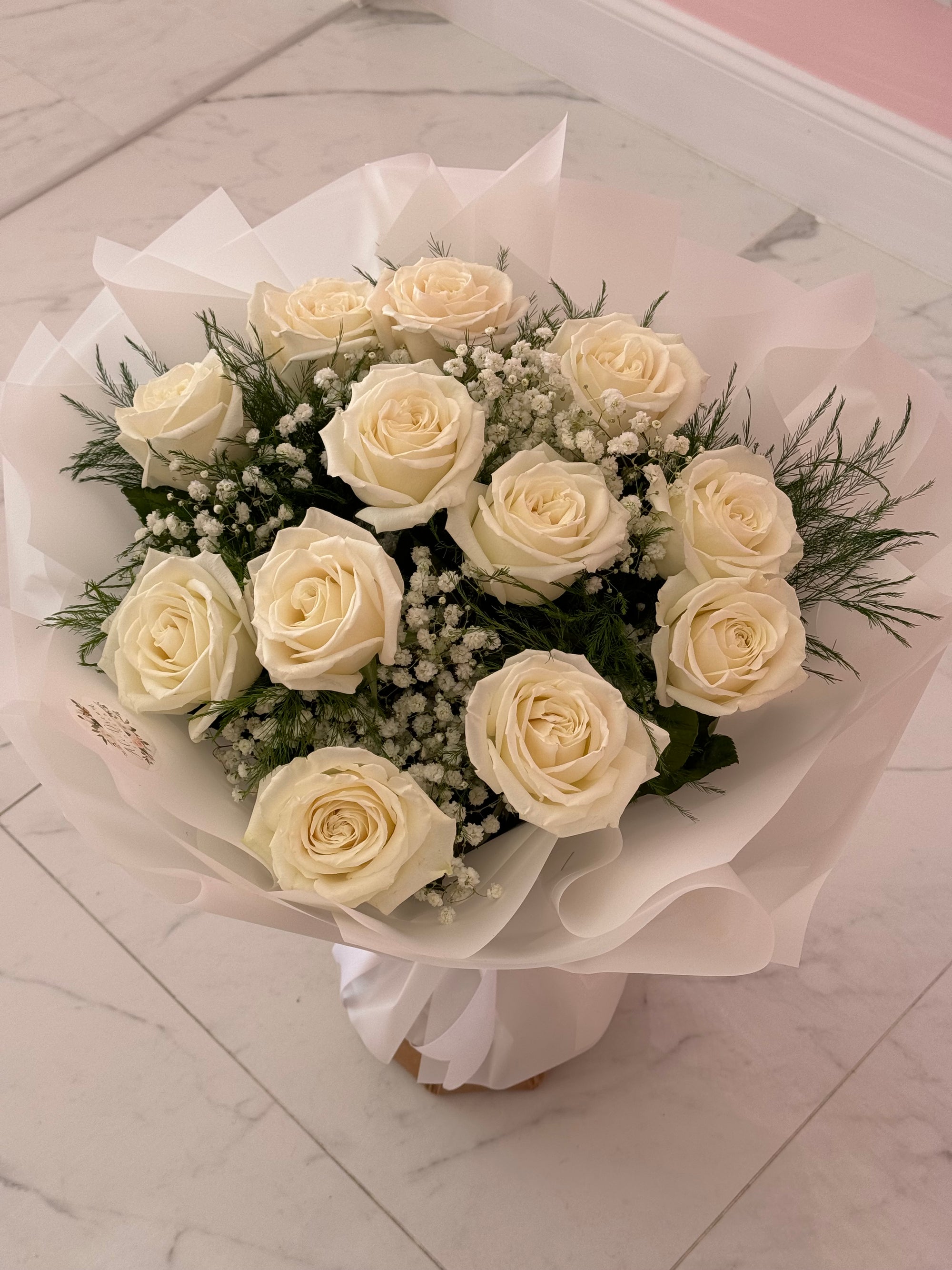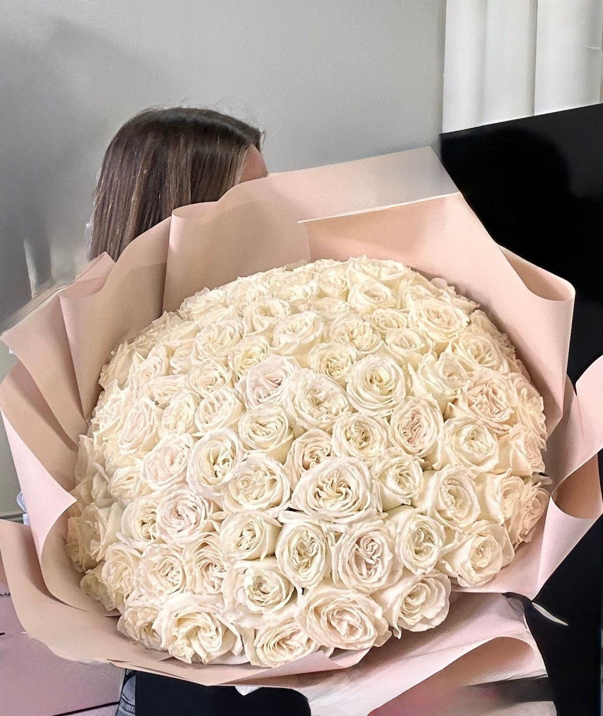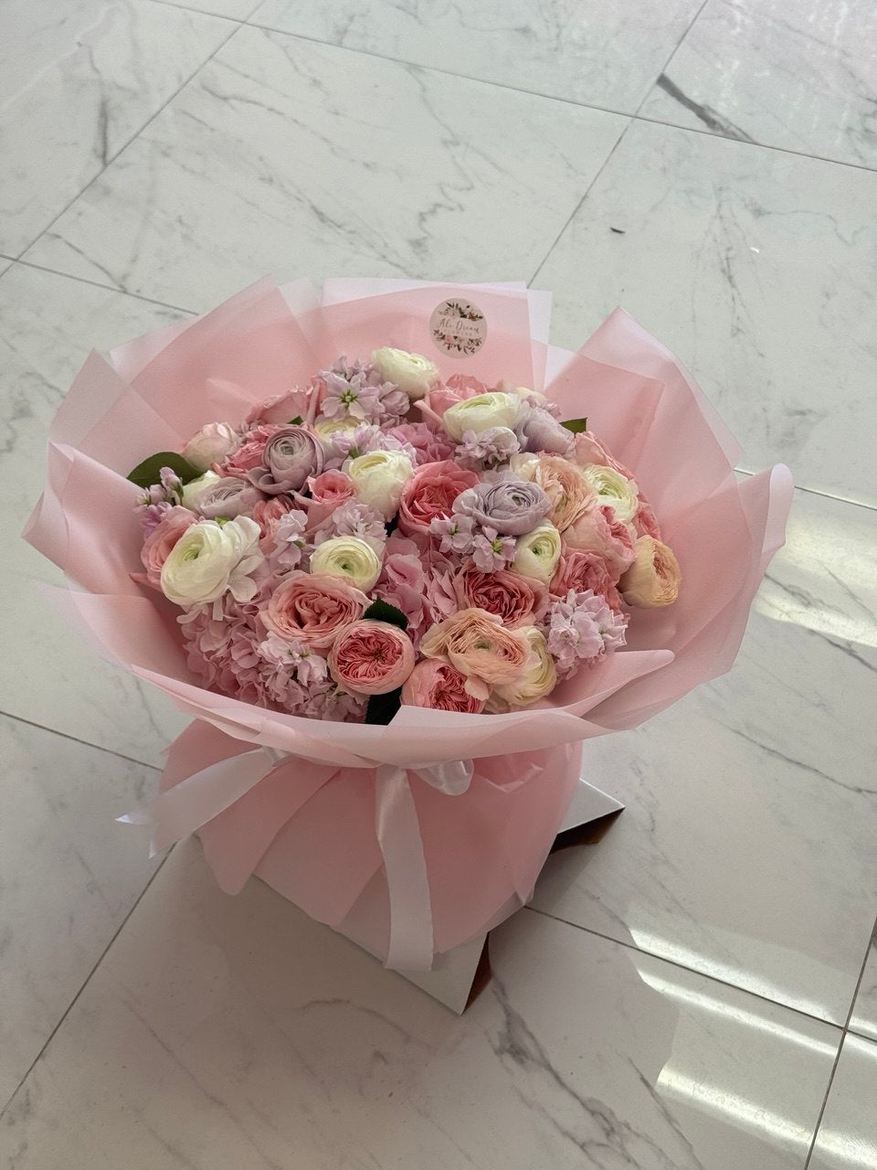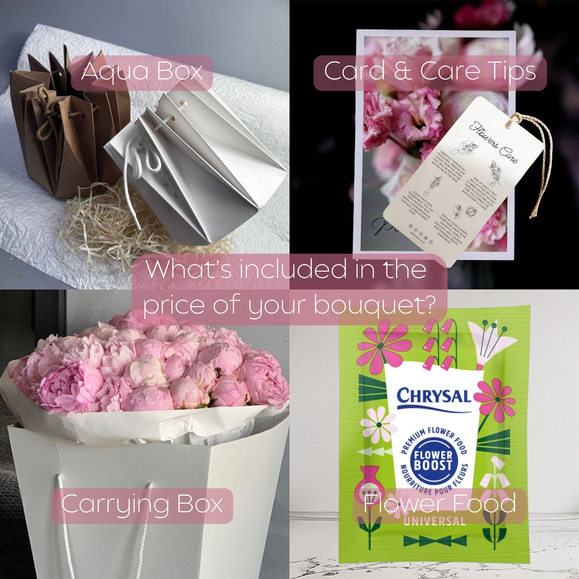 All our bouquets come with paper wrapping, a signature ribbon, an aqua box, and a craft bag for comfortable transportation. Additionally, we provide flower food, flower care tips, and a complementary note card to complete your gift.We believe in providing a complete package to ensure that your flowers are beautifully presented and well-cared for, from the moment they leave our shop to when they arrive at their destination.Our attention to detail extends to every aspect of your bouquet, so you can trust that your gift will be a truly memorable experience for your recipient.